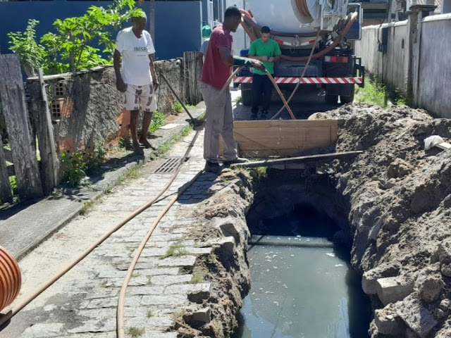 Enquanto uma equipe limpa galerias pluviais no Recreio, outra atua no canal de Nova Cidade. É um esforço coordenado, diário, que evita que os problemas se acumulem.