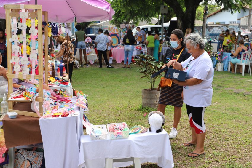 Colares de concha, quadros com paisagens da região, bolsas bordadas. Cada peça carrega história, cultura e orgulho local.